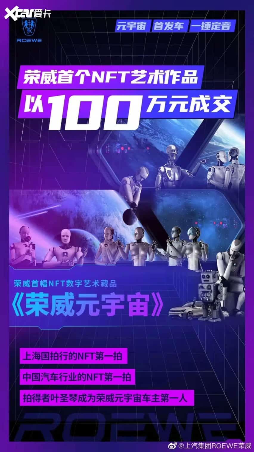 上汽荣威首幅 NFT 数字艺术藏品《荣威元国际》NFT 拍卖 100 万元成交。据了解,拍得者不只取得数字藏品《荣威元国际》NFT,还将具有荣威龙猫“元定制”实车一辆,成为荣威首位元国际车主,一起她还将免费享用“高档定制PLUS”服务,包含在上汽荣威元国际版图中,任职上汽荣威元国际鉴品官。 作为我国轿车职业NFT的首拍,《荣威元国际》NFT拍卖不只是上汽荣威在年代革新中的一次全新测验,更敞开了我国轿车职业探究元国际的新征途。