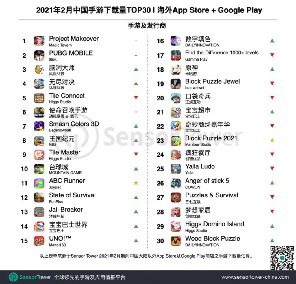Magic Tavern《Project Makeover》以逾越1000万次下载连任第一。上一年11月上市以来,该游戏累计取得逾越5700万次下载,是同期全球下载量最高的消除手游。在美国和日本,该游戏排列同期手游下载榜第2和第3名。