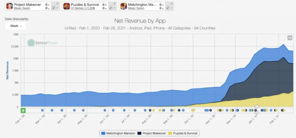 在消除手游赛道,Magic Tavern《Project Makeover》和三七互娱《Puzzles & Survival》排名别离较1月行进1位和5位。跟着这两款游戏的参加,我国厂商在海外Puzzle手游的收入占比从2020年2月2.5%,提升至9.2%。曩昔一年,Puzzle手游在海外商场的收入仅增加了25%,但我国厂商在这一赛道却完成了368%的年增加。