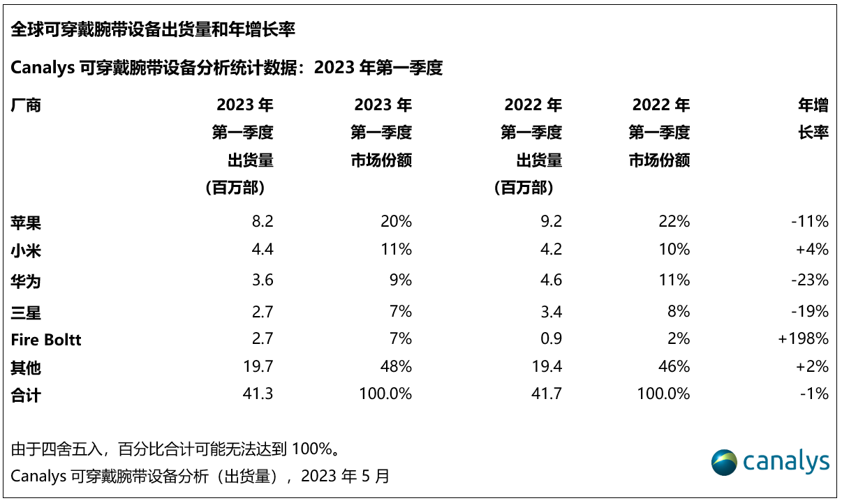 Canalys研讨分析师 Jack Leathem 表明:“苹果的生态系统具有极强的顾客忠诚度,加之供给全面的智能手表功用,因而持续坚持商场主导地位。虽然苹果的出货量在2023 年第一季度跌 11%,但仍占有 20% 的商场比例。”小米上一年的产品组合调整获得了较好的作用,在第一季度的销量排名第二。小米的品牌进步战略将侧重于中高端根本款手表,一起凭仗价格适中的根本腕带设备和手表,进步全体销量。华为和三星排列第三和第四位,阐明致力于构建智能手机生态系统的厂商,在手环商场占有的比例也更高。第五名的Fire Boltt 初次跻身前五之列,也是五大中仅有的非智能手机厂商,且仅在印度出售可穿戴腕带设备。该品牌凭仗广泛的产品类型和具有竞争力的价格,完成198% 的惊人添加。