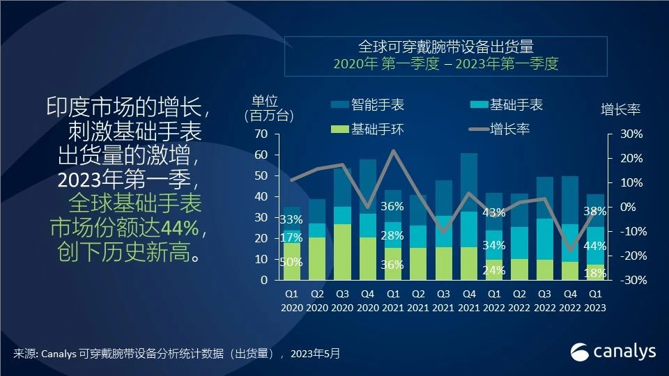 依据Canalys发布的数据,2023 年第一季度,全球可穿戴腕带设备出货量同比下降1% 至 4100 万件。印度商场却鹤立鸡群,同比添加122%,抵消全球 14% 的年下滑起伏。因为厂商和顾客越来越重视更大屏幕的设备,全球可穿戴腕带设备出货量持续萎缩,下降24% 至 750 万台。但在印度微弱需求的拉动下,全球根底手表出货量大幅添加28% 至 1800 万台。相比之下,智能手表出货量下降11% 至 1580 万台。